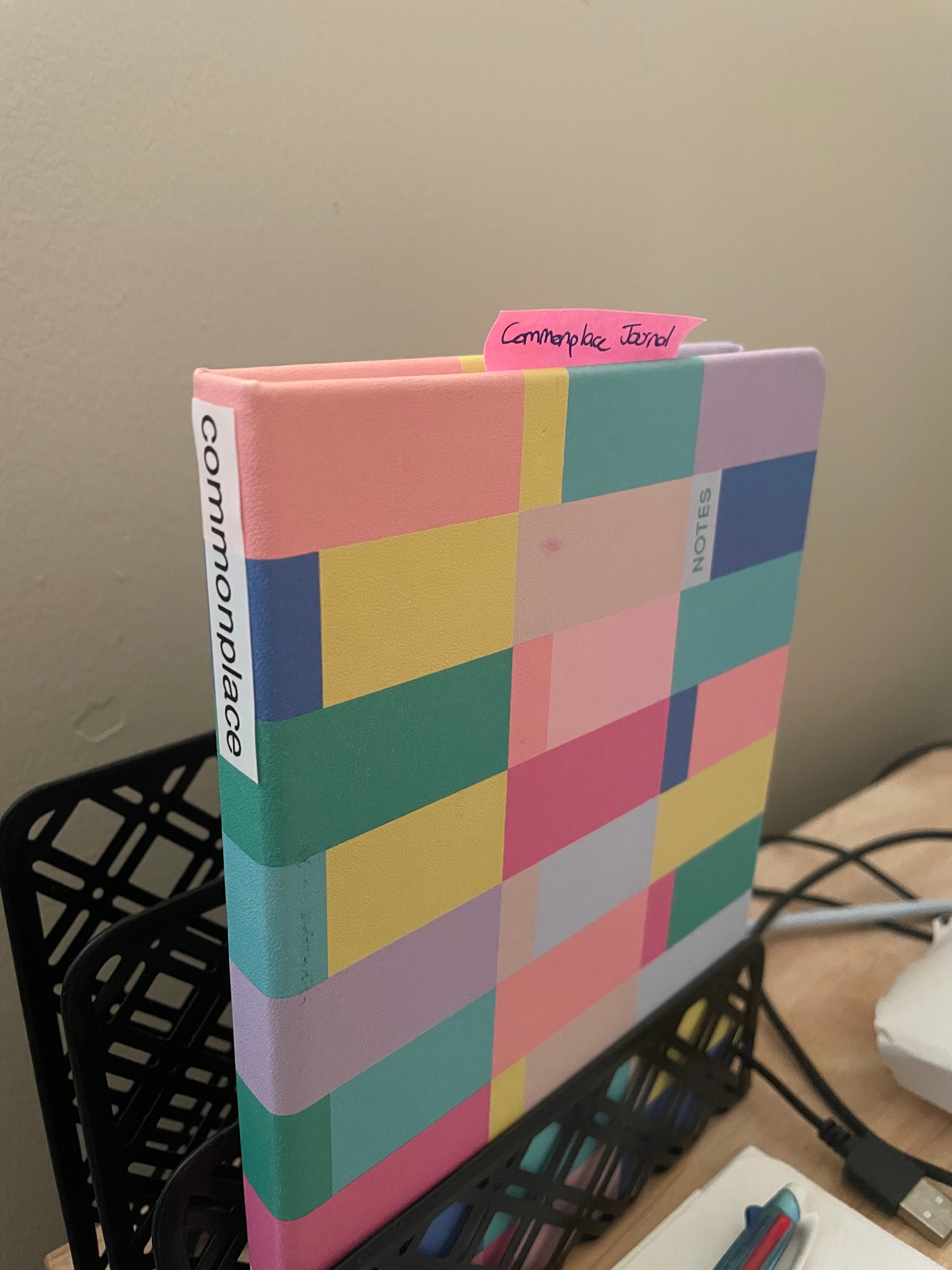 Image description: a colourful hard cover notebook sits in a black letter holder. On its spine, made from a generic label maker, is the word “commonplace”.